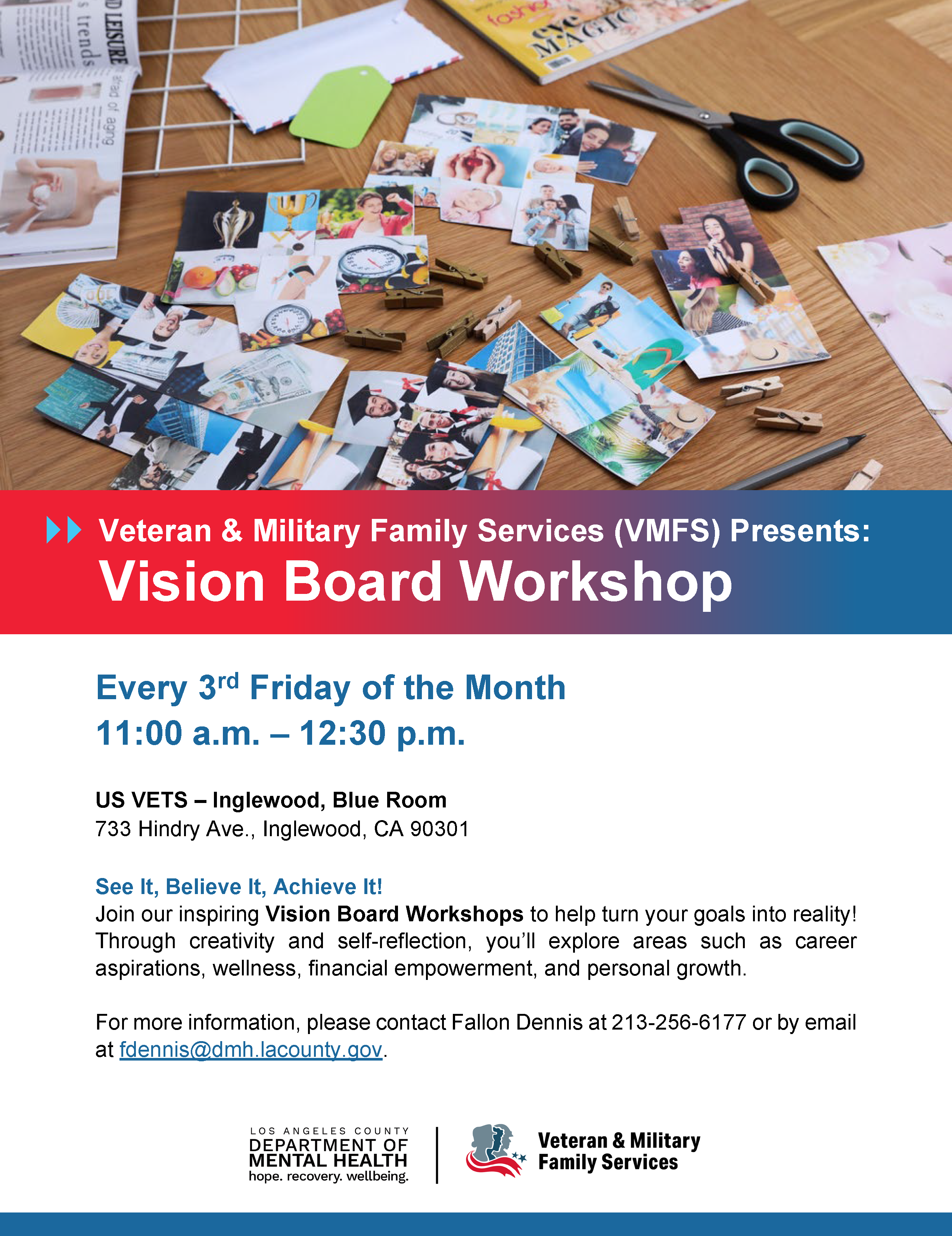 « All Events This event has passed. Vision Board Workshop for Veterans and Military Families April 18 @ 11:00 am - 12:30 pm « SALT 1 MEETING – APRIL 17, 2025 Service Area 5 (Palms/Mar Vista – Intergenerational) Health Neighborhoods Meeting – April 18, 2025 » Add to calendar Google Calendar iCalendar Outlook 365 Outlook Live Details Date: April 18 Time: 11:00 am - 12:30 pm Event Category: Veteran Events Venue US VETS – Inglewood 733 Hindry Ave Inglewood, California 90301 + Google Map