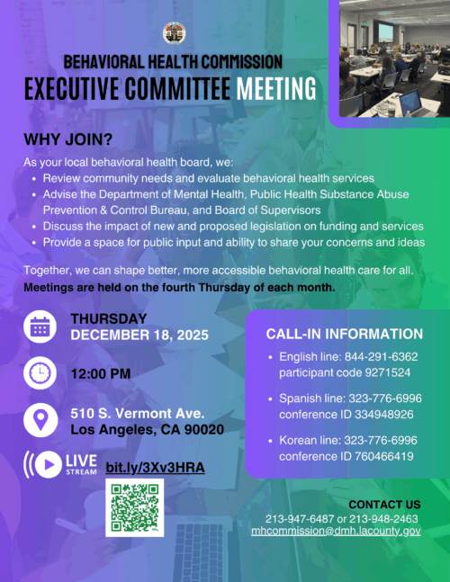 BHC REGULAR MEETING Agenda English Spanish Ways to participate: Watch live stream: MS Teams Link Join in-person: 510 S Vermont Ave., 9th floor (Level T) Conference Room, Los Angeles 90020. FREE parking is available at 523 Shatto Place, Los Angeles, CA 90020. Live Closed Captioning (CART) Link Members of the public can address the BHC during […]