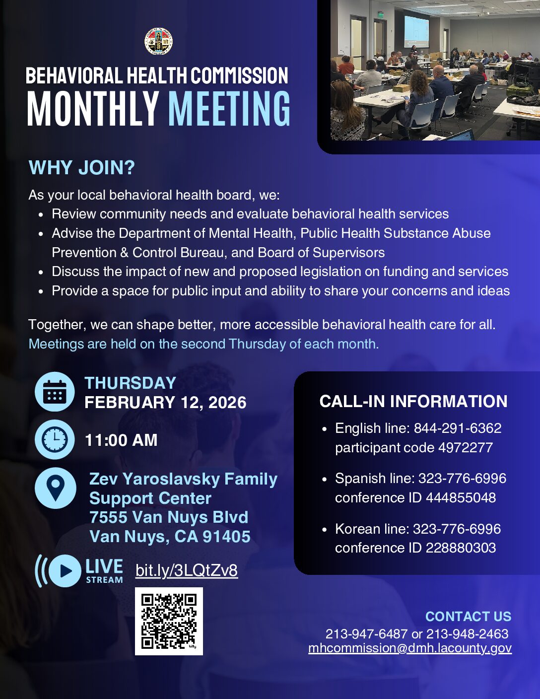 FeaturedDMH Headquarters -Terrace Level Conference Rooms -BH Commission Meetings 510 S Vermont Avenue, 9th Floor, (T) Level, Los Angeles, CA, United StatesBHC REGULAR MEETING Agenda English Spanish Ways to participate: Watch live stream: MS Teams Link Join in-person: 510 S Vermont Ave., 9th floor (Level T) Conference Room, Los Angeles 90020. FREE parking is available […]
